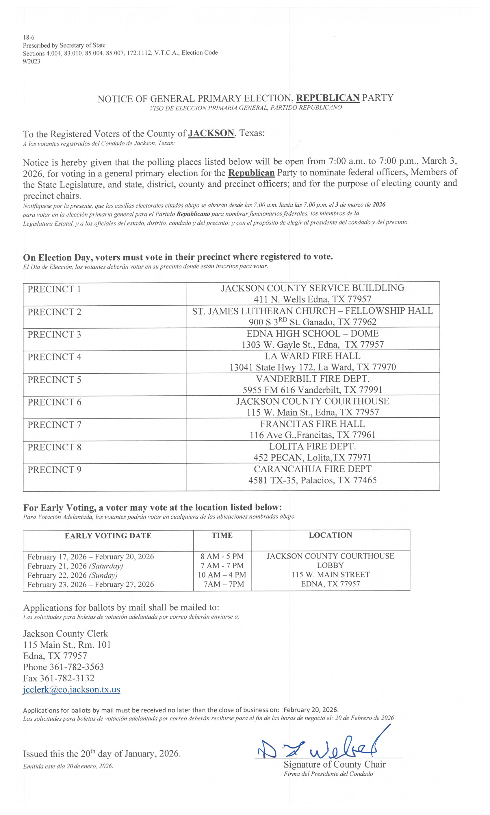 If you plan to go alone to vote curbside, it is wise to call ahead to the Jackson County Clerk's Office @ (361) 782-3563 so election officials will expect you and can give instructions on where to park. Generally speaking, you may vote curbside during the early voting period or on Election Day.